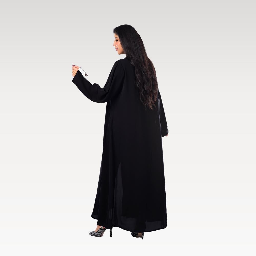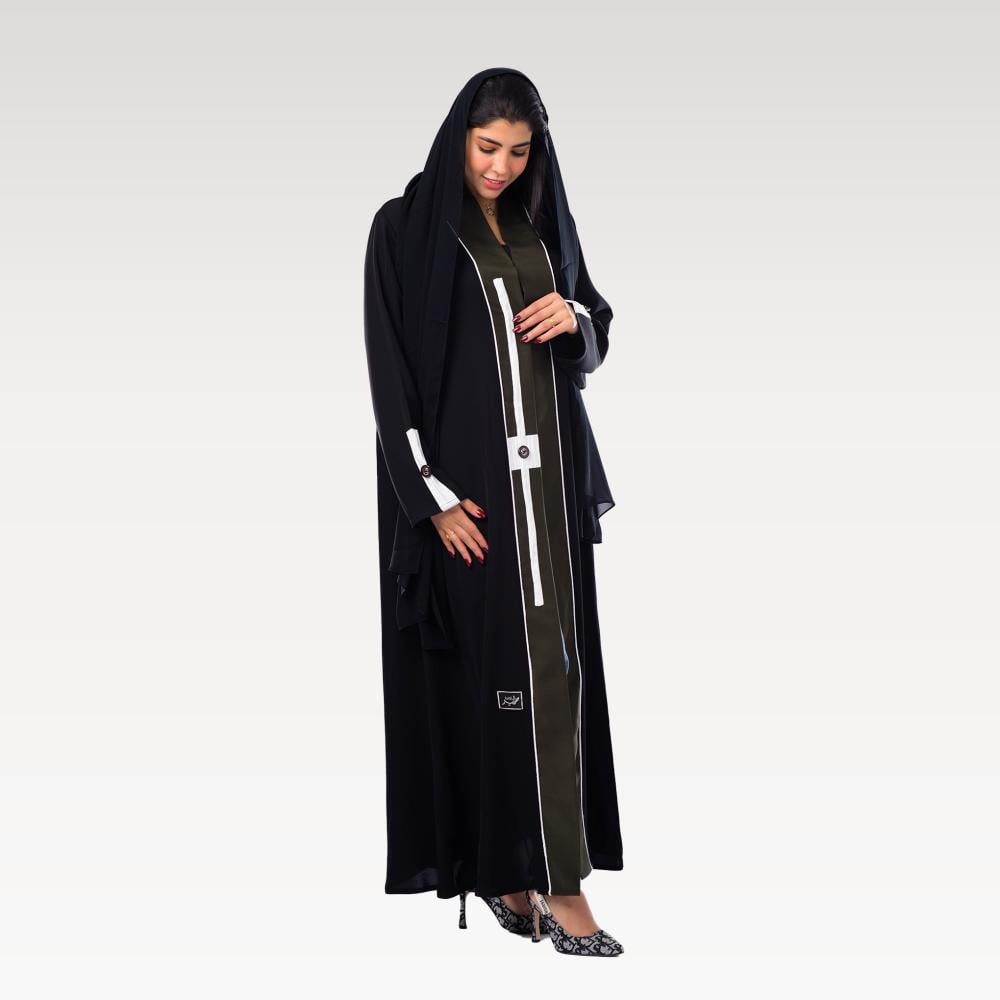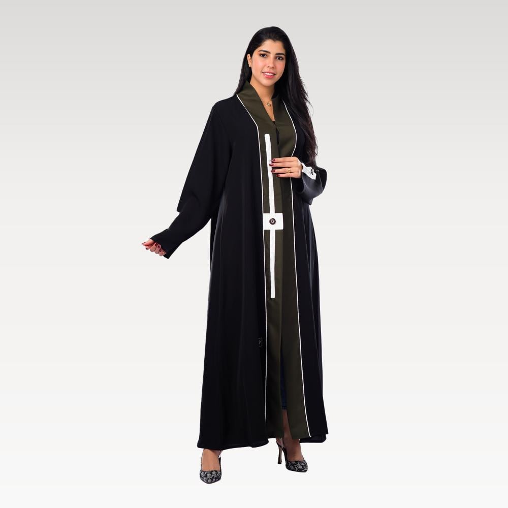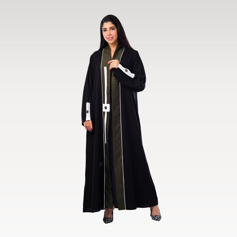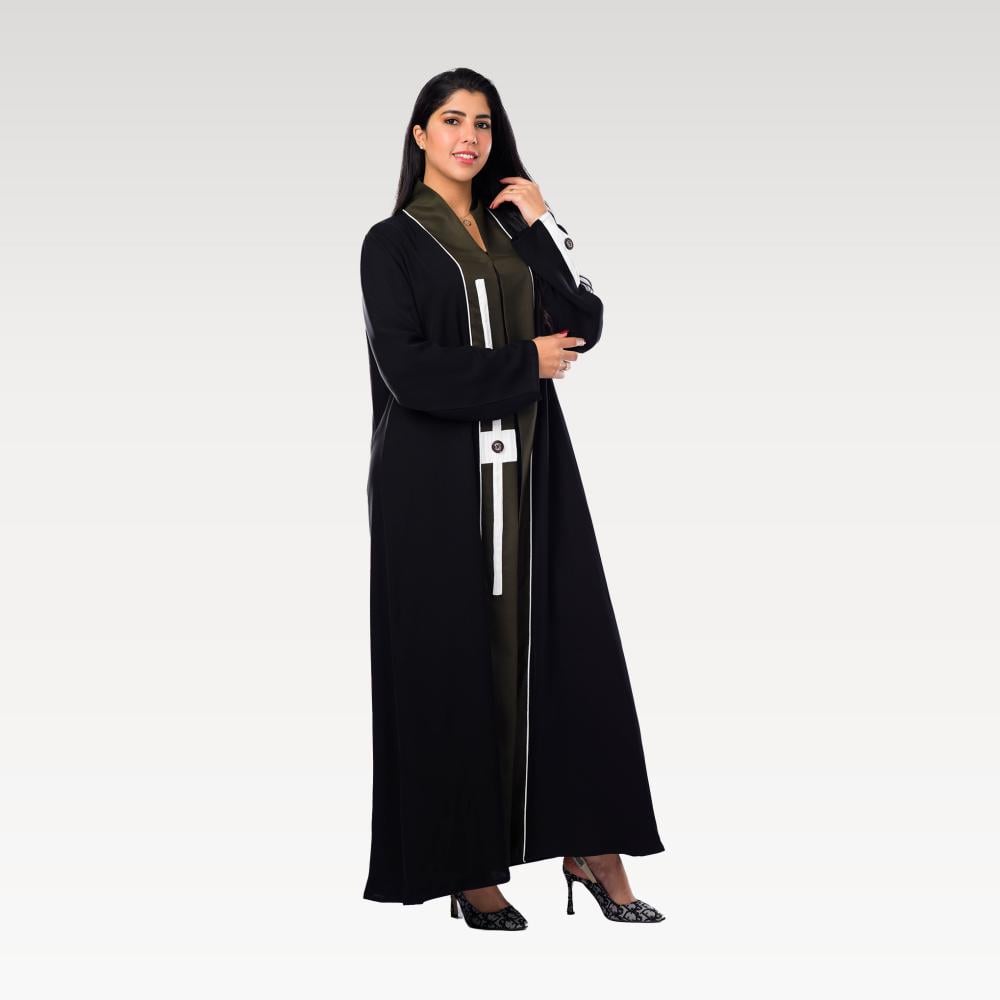 عباية "أفق الليل" تجسد سحر الغموض، مصنوعة من قماش أسود فخم. تتميز بتفاصيل أنيقة تشمل أزرارًا وخطوطًا بيضاء تتداخل مع لون رمادي في الوسط، مما يخلق تباينًا مميزًا.