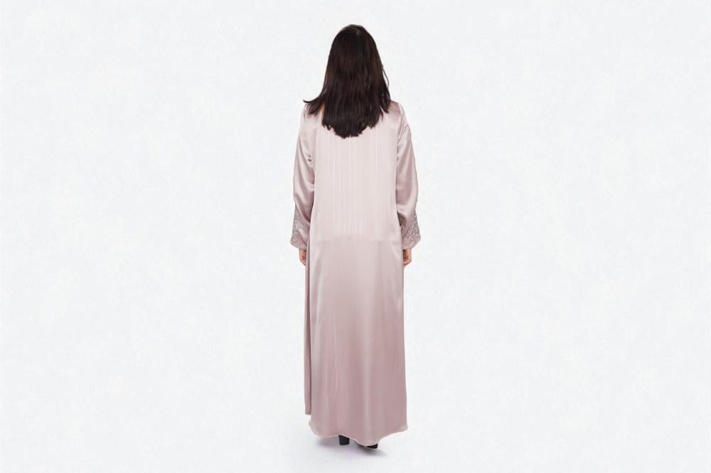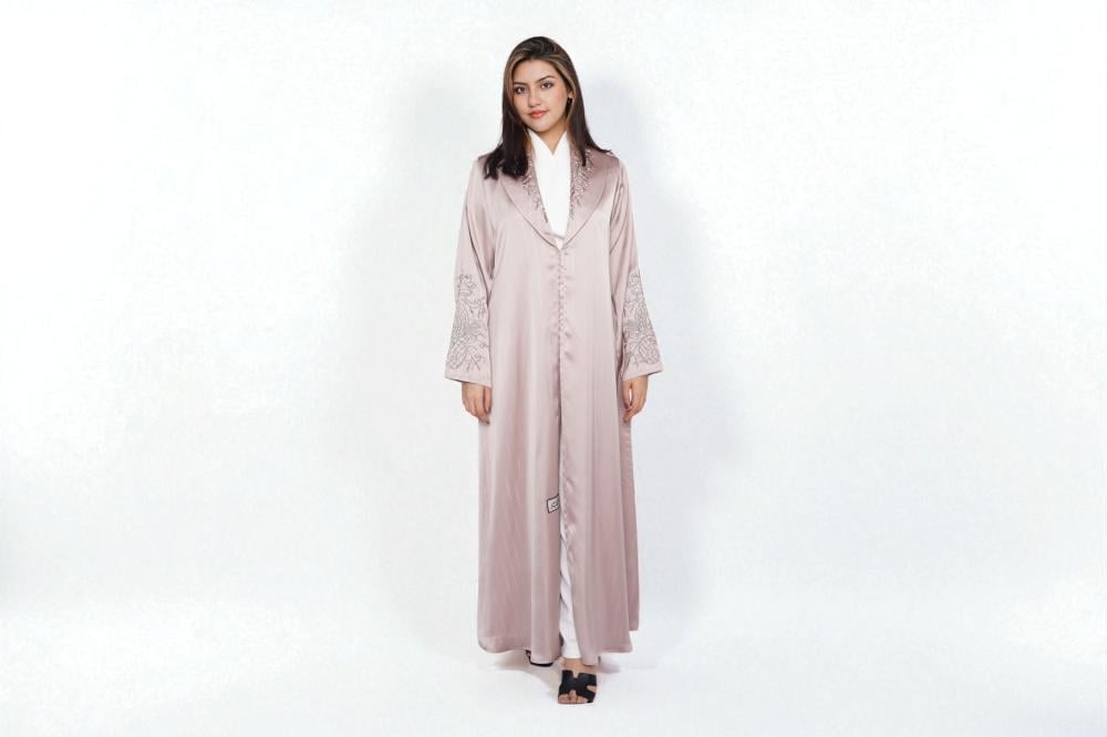 تتميّز بلون وردي فاتح هادئ يعبّر عن الأنوثة والرقي، مع تطريز دقيق على الأكمام والياقة بأسلوب زخرفي فاخر يعكس عناية عالية بالتفاصيل.