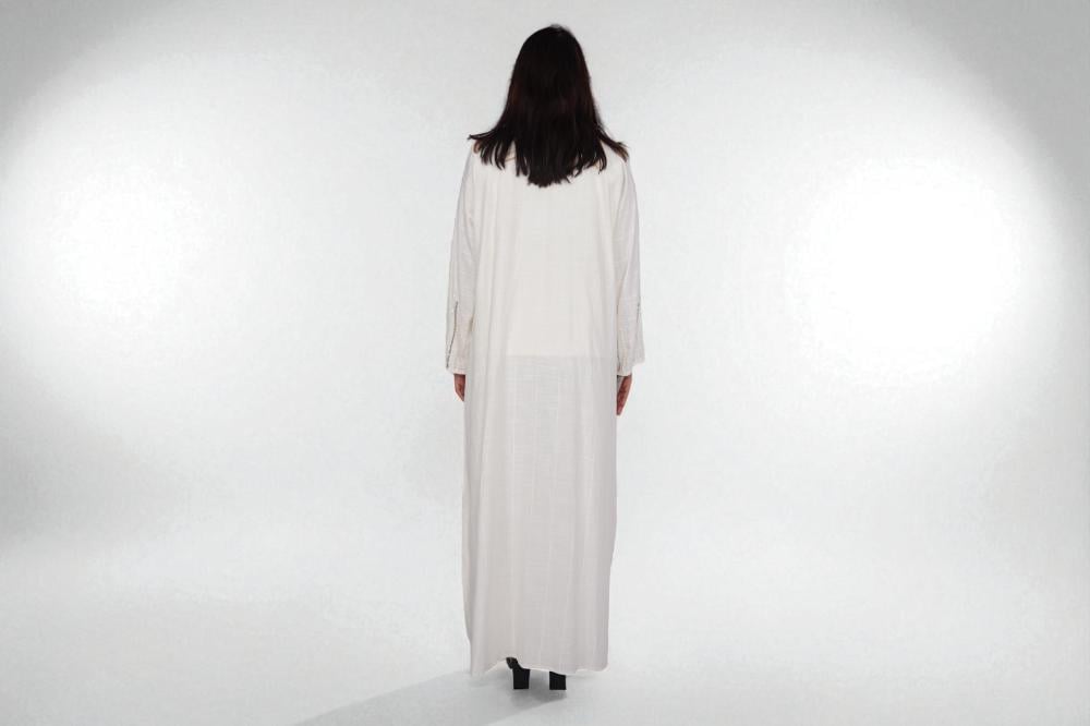 عباية بيضاء أنيقة تجمع بين البساطة والفخامة بتصميم راقٍ مزين بخطوط تطريز لامعة على الصدر والأكمام، تمنحك لمسة فخمة ومظهرًا راقيًا في المناسبات الخاصة أو الإطلالات النهارية الفاخرة.