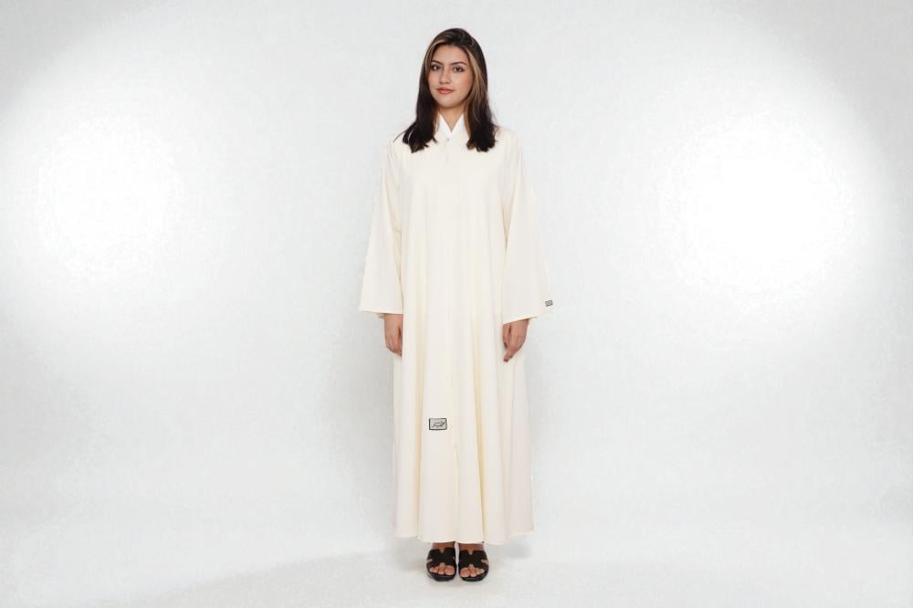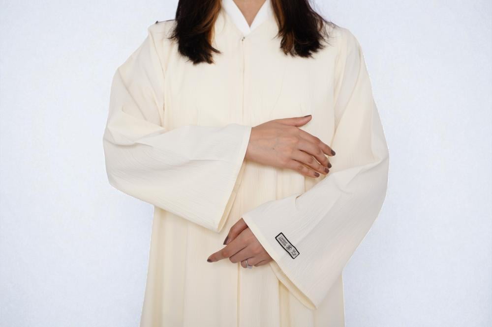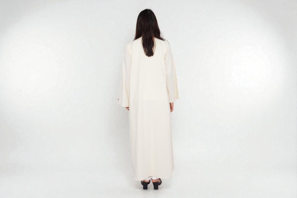 إطلالة ناعمة تجمع بين البساطة والفخامة، تأتي هذه العباية بلون أوف وايت هادئ يمنحك حضورًا راقيًا ومظهرًا أنثويًا أنيقًا.