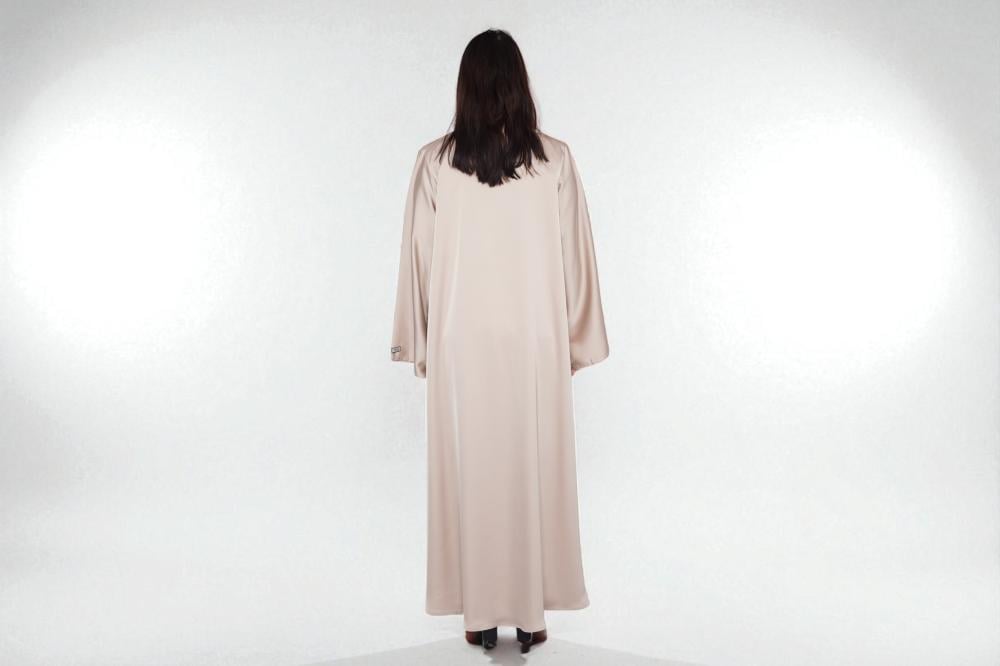 عباية فاخرة بلون بيج فاتح راقٍ تمنحك إطلالة ناعمة وفخمة في الوقت ذاته.