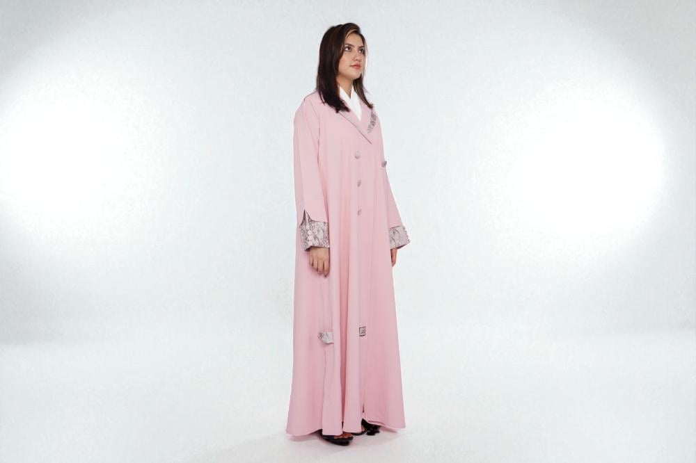 تألقي بإطلالة تجمع بين النعومة والفخامة مع هذه العباية الوردية الفاتحة المصممة بذوق رفيع لتمنحك حضورًا أنثويًا مميزًا في كل مناسبة.