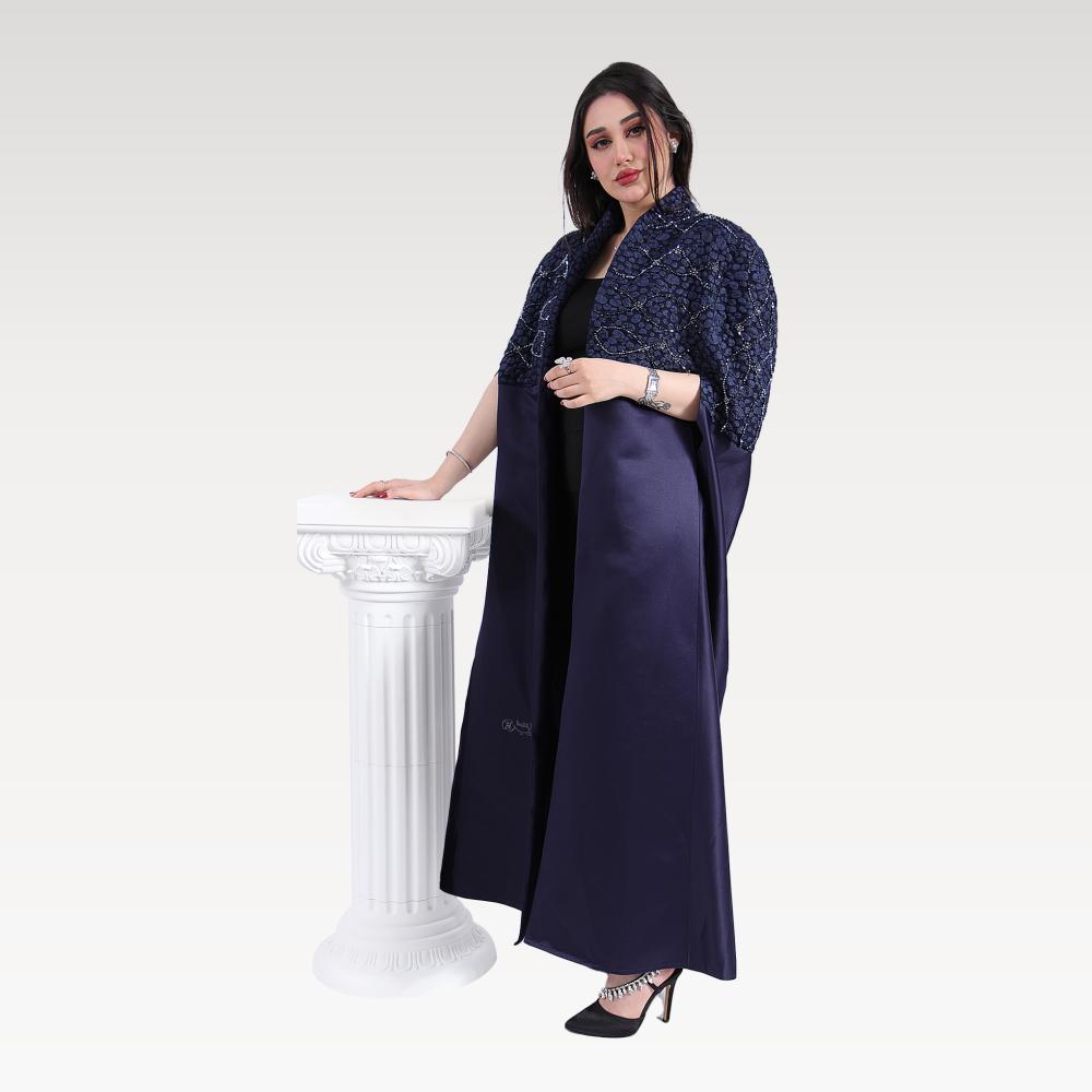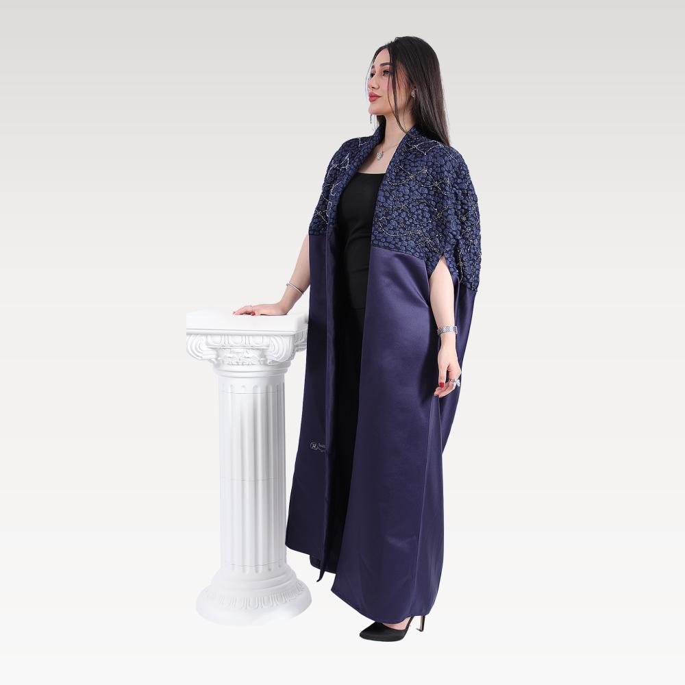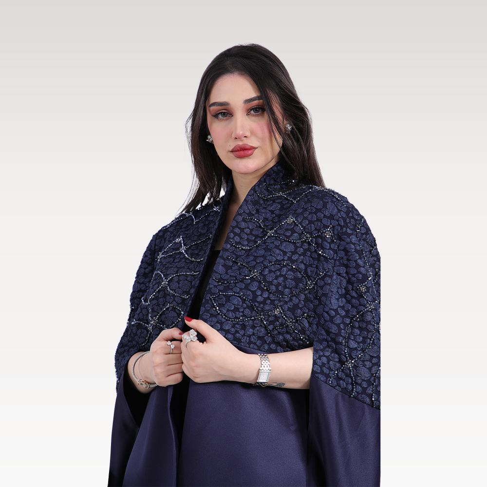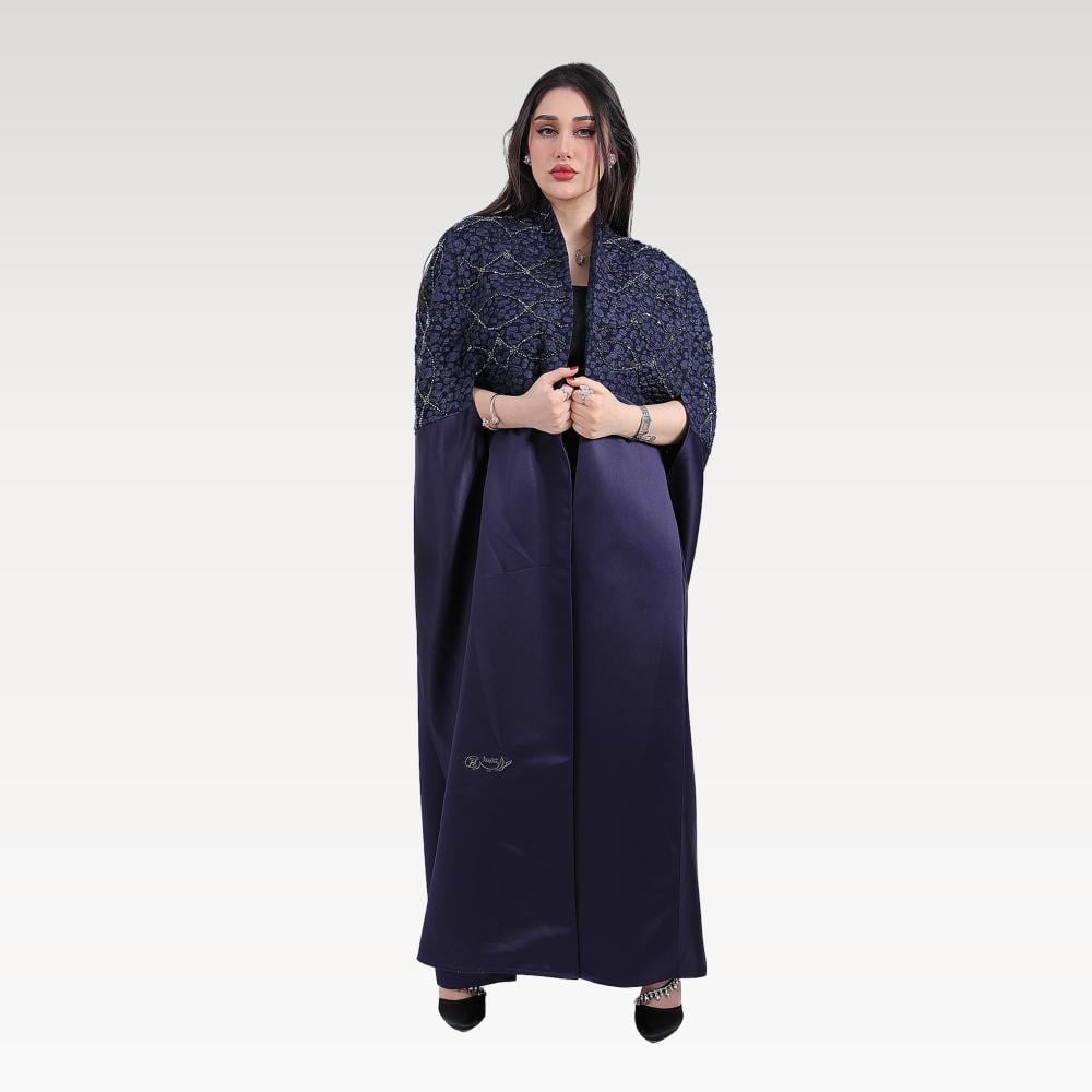 استعدي لإطلالة ملكية تنبض بالفخامة مع عباية بريق الأفق بلونها الكحلي الغني وتطريزها الفضي الأنيق. تجمع هذه العباية بين التصميم الكلاسيكي واللمسات العصرية، لتكون خياركِ المثالي في جميع المناسبات الرسمية والإطلالات اليومية الراقية.
