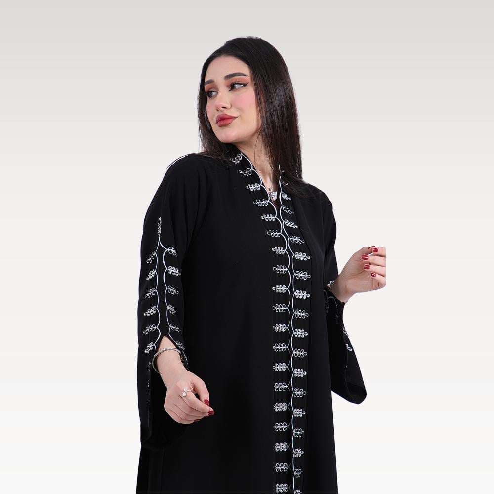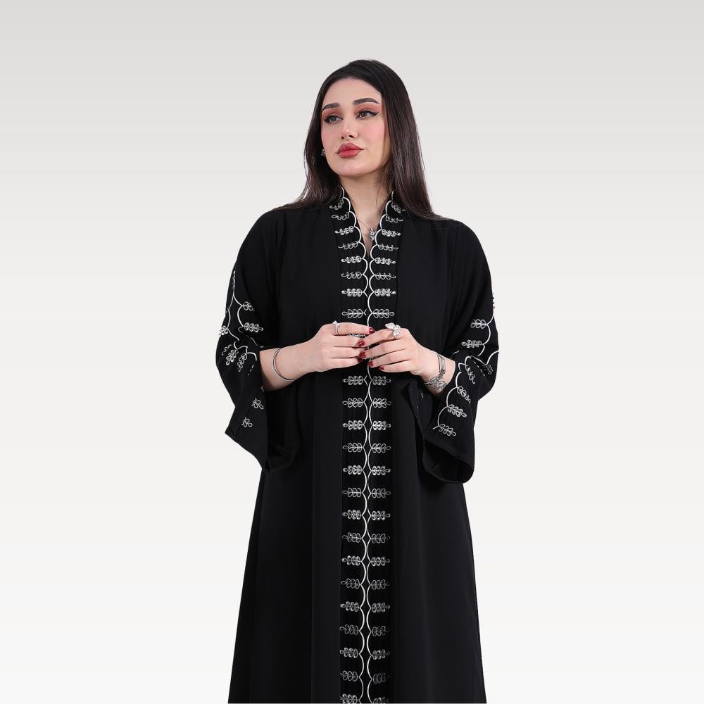 مستوحاة من توهج الليل، تعكس العباية تميزاً بتفاصيلها الأنيقة، حيث يتناغم الأسود مع الشك الفضي ليخلق تبايناً ناعماً. الخيار المثالي للمناسبات الخاصة.
