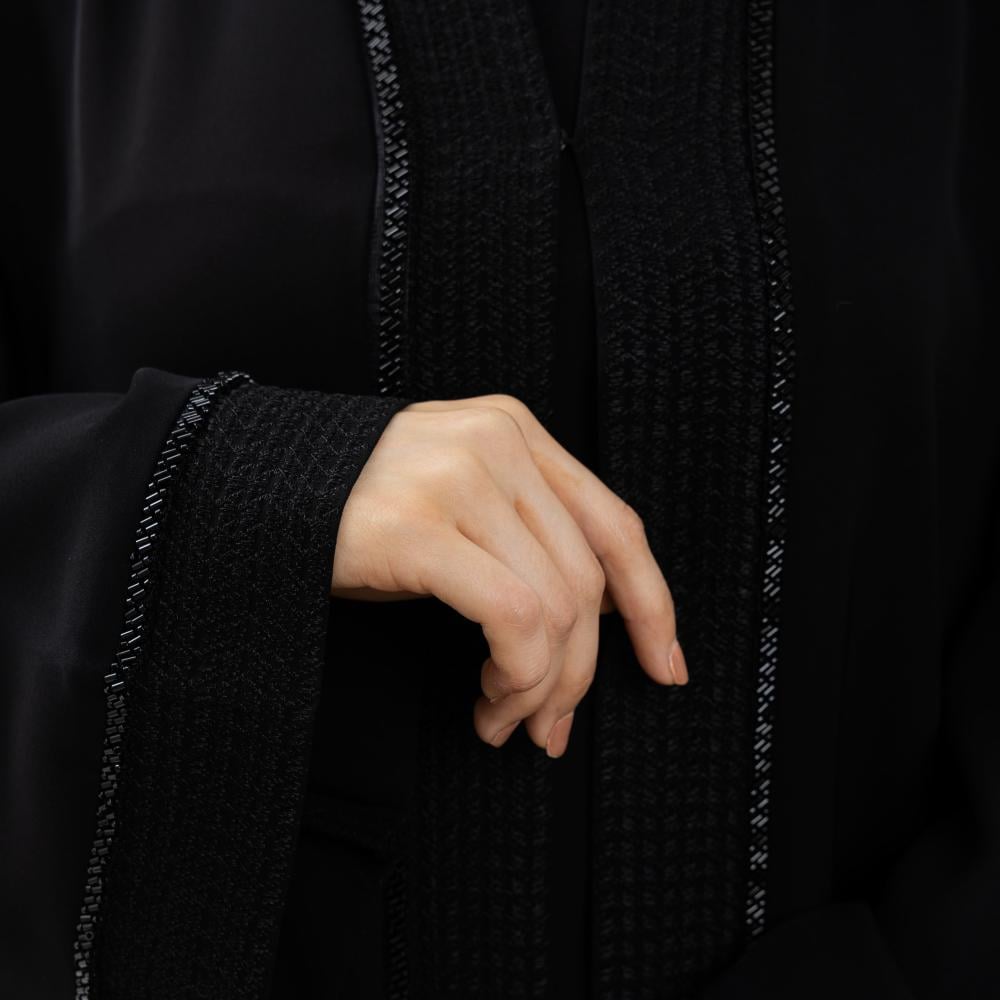 عباية سوداء عملية بتصميم يجمع بين البساطة والأناقة، مصنوعة من قماش إنترنت الفاخر المستورد من كوريا، مما يمنحكِ راحة مثالية ولمسة راقية في آنٍ واحد. تتميز بتفاصيل أعمال يدوية أنيقة من الأمام وعلى الأكمام، مما يضفي عليها لمسة فريدة من التميز دون المبالغة في الزخرفة. تصميمها العملي يجعلها خيارًا مثاليًا للاستخدام اليومي أو المناسبات البسيطة، حيث توفر لكِ الانسيابية والراحة مع لمسة من الأناقة المتقنة.