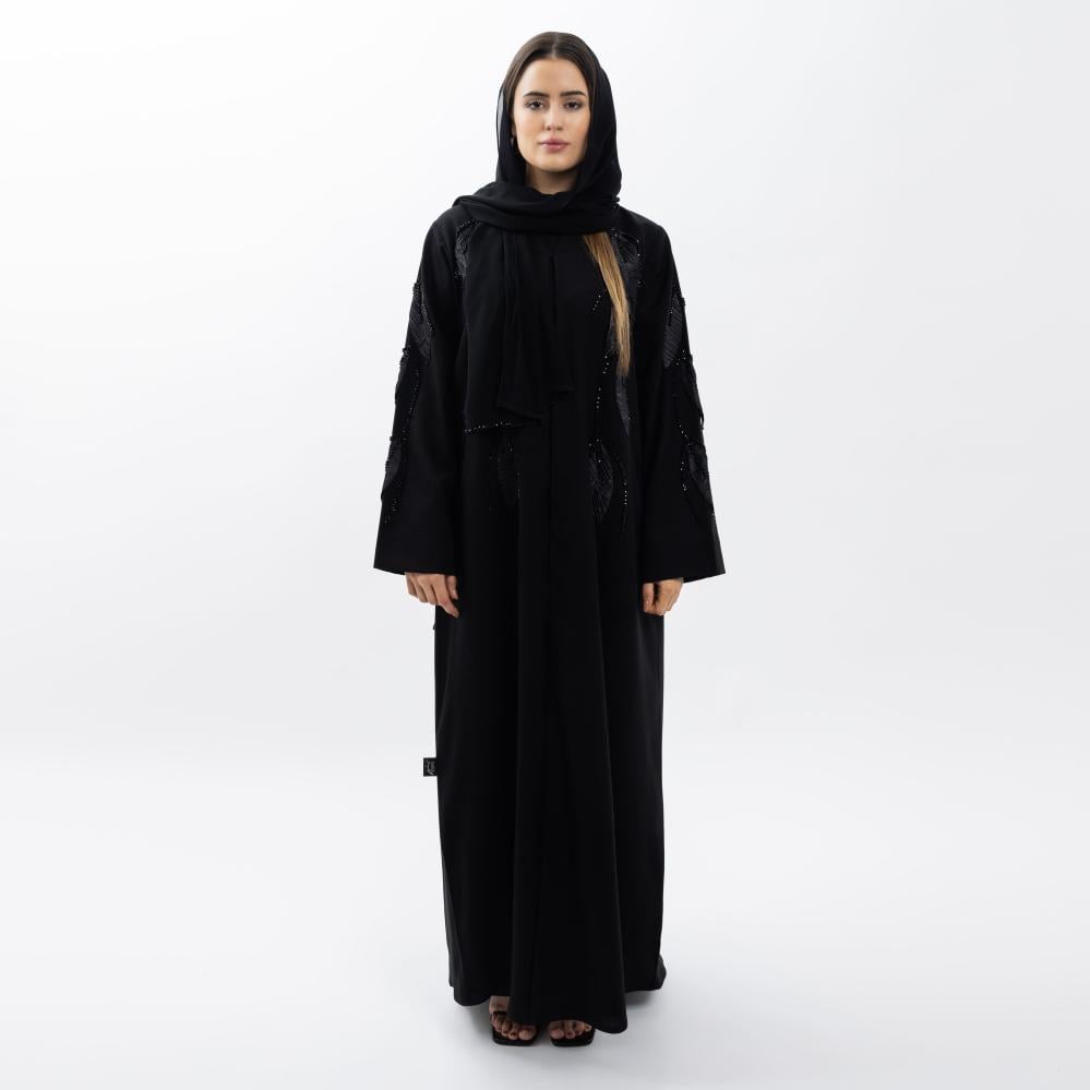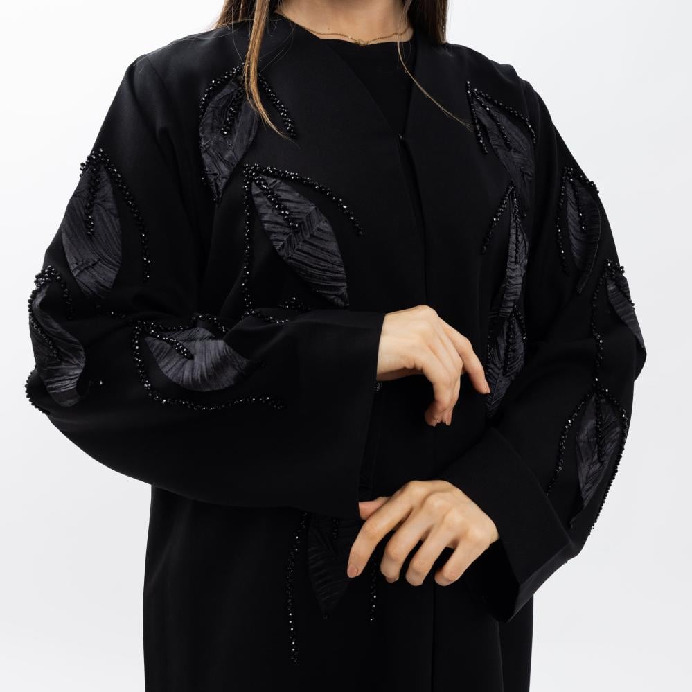 عباية سوداء مصنوعة من كريب فاخر، تجمع بين الجمال والفخامة في تصميم عصري. الجزء الأمامي والخلفي من العباية مزخرف بـ أوراق زهور سوداء مطرزة بشكل رائع باستخدام خيوط سوداء وخرز لامع، مما يضفي لمسة فاخرة ويعكس أناقة لا مثيل لها. الخرز الأسود يبرز جمال الزهور ويمنح العباية بريقًا يعكس التميز والجاذبية. قماش الكريب المريح والمرن يضمن لكِ إطلالة مريحة وأنيقة طوال اليوم.