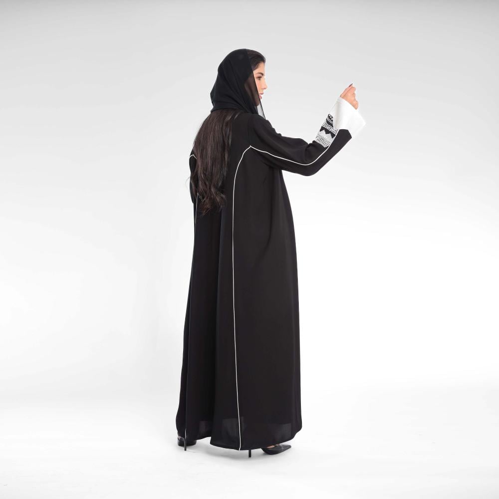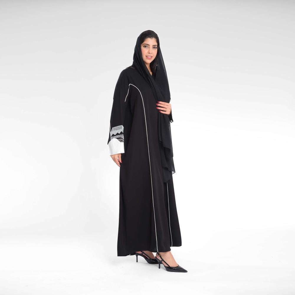 الجزء الأمامي مزين بخطوط بيضاء تنساب بانسيابية على طول العباية، بينما تأتي الأكمام مزخرفة بنفس الخطوط مع تطريز أبيض ناعم في نهايتها، مما يضفي لمسة فاخرة ويبرز جمال التصميم. خامة الكريب الناعم تمنحك الراحة والمرونة طوال اليوم، لتكون العباية مثالية للمناسبات اليومية أو الاحتفالات الصغيرة.