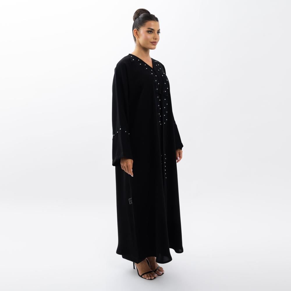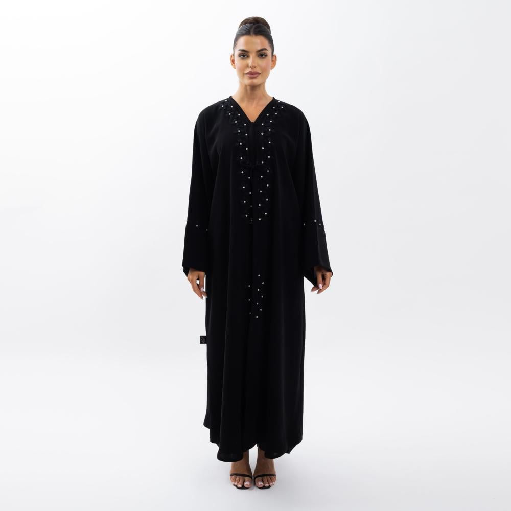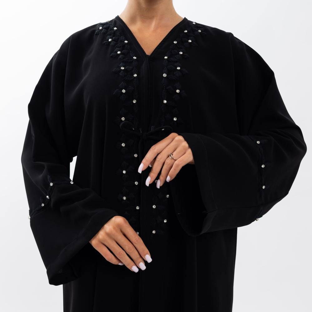 تتميز العباية بتطريز فخم على الصدر والأكمام، مع قصة ربع كلوش تمنح انسيابية أنثوية تضيف لمسة فخامة متزنة تليق بالذوق الرفيع.