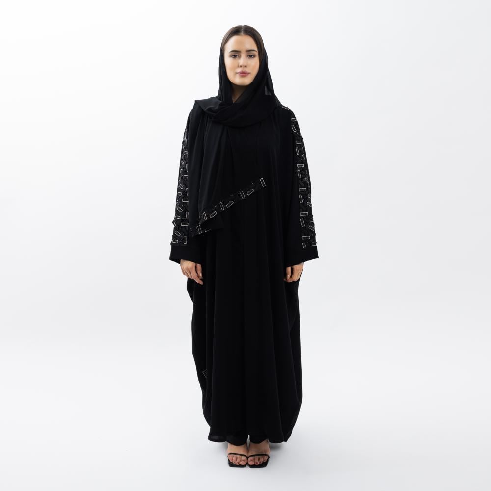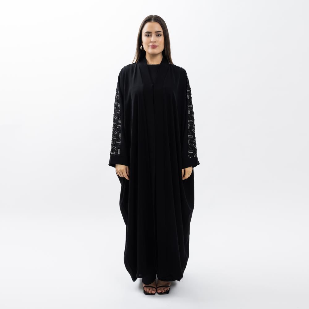 تصميم مبتكر من قماش الكريب الفاخر بقصة نص بشت تمنحك حضورًا فخمًا ولمسة انسيابية أنيقة، مع تفاصيل مطرزة على الأكمام تضيف لمسة بريق راقٍ يناسب أجواء المناسبات.