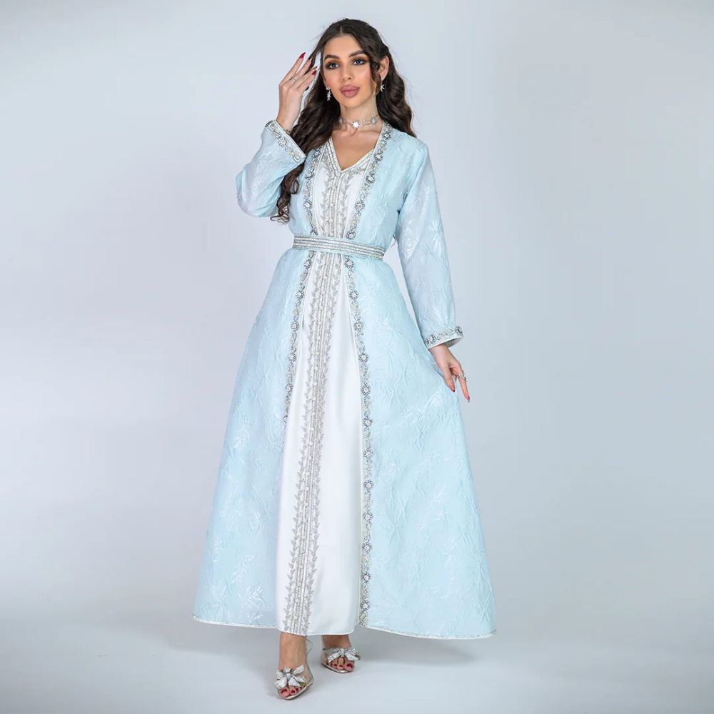 قفطان مغربي فاخر، مصمم من قماش جاكار هندي خام ذو جودة عالية، يتيح لكِ التمتع بالأناقة والفخامة في كل مناسبة. يتميز القفطان بتصميم شك يدوي متقن على الأجزاء الأمامية والأكمام، مما يضفي لمسة من الحرفية والتميز. قصة القفطان المغربي تتناغم مع الطابع التقليدي والأنيق، مما يجعله الخيار المثالي للمناسبات الكبرى والاحتفالات. القفطان يمنحكِ راحة وحركة مرنة بفضل خامته الفاخرة والتصميم العصري.