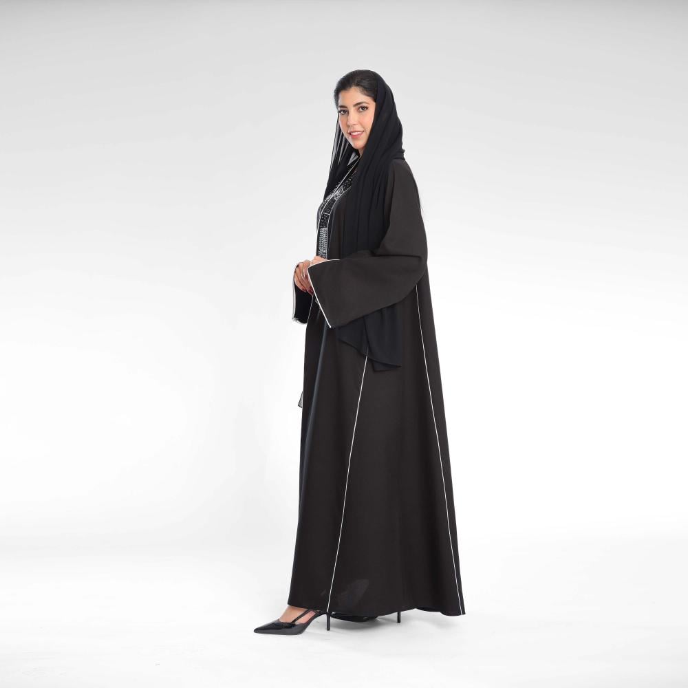 الجزء العلوي مزخرف بتطريز من الكريستالات اللامعة بالفضي والأسود، بينما تمتد الخطوط البيضاء الأنيقة على الجزء الأمامي والجانبي، لتضفي لمسة من التميز والفخامة على التصميم. خامة الكتان الفاخر توفر الراحة والتهوية المثالية طوال اليوم، لتكون العباية الخيار الأمثل للمناسبات الرسمية والأوقات الخاصة.