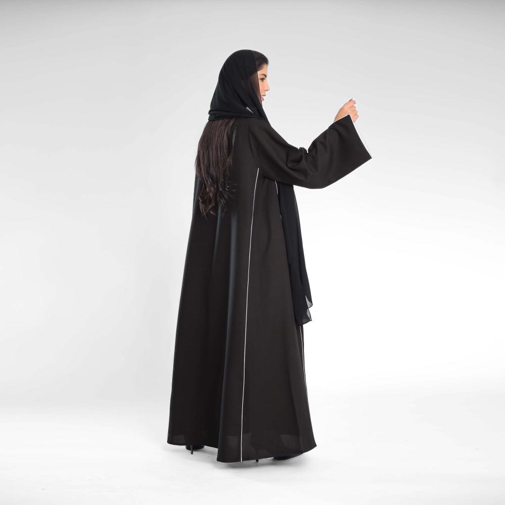 تألقي بإطلالة فاخرة مع عباية سوداء من كتان فاخر تجمع بين التصميم العصري والتفاصيل الدقيقة.