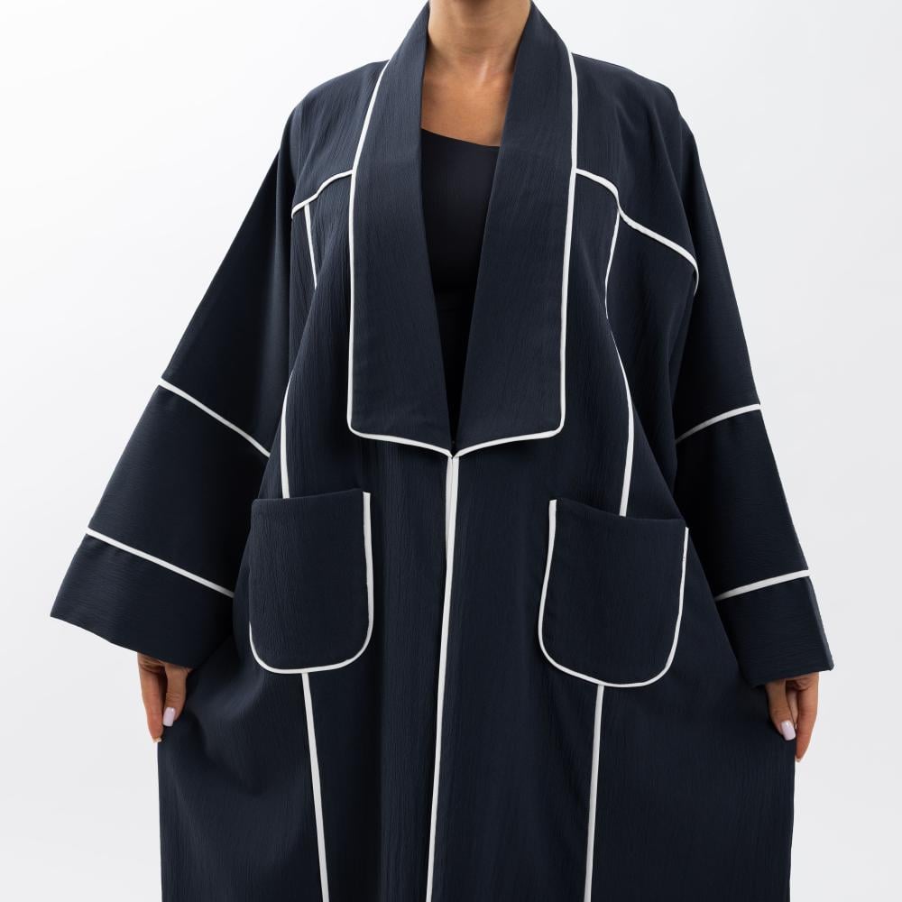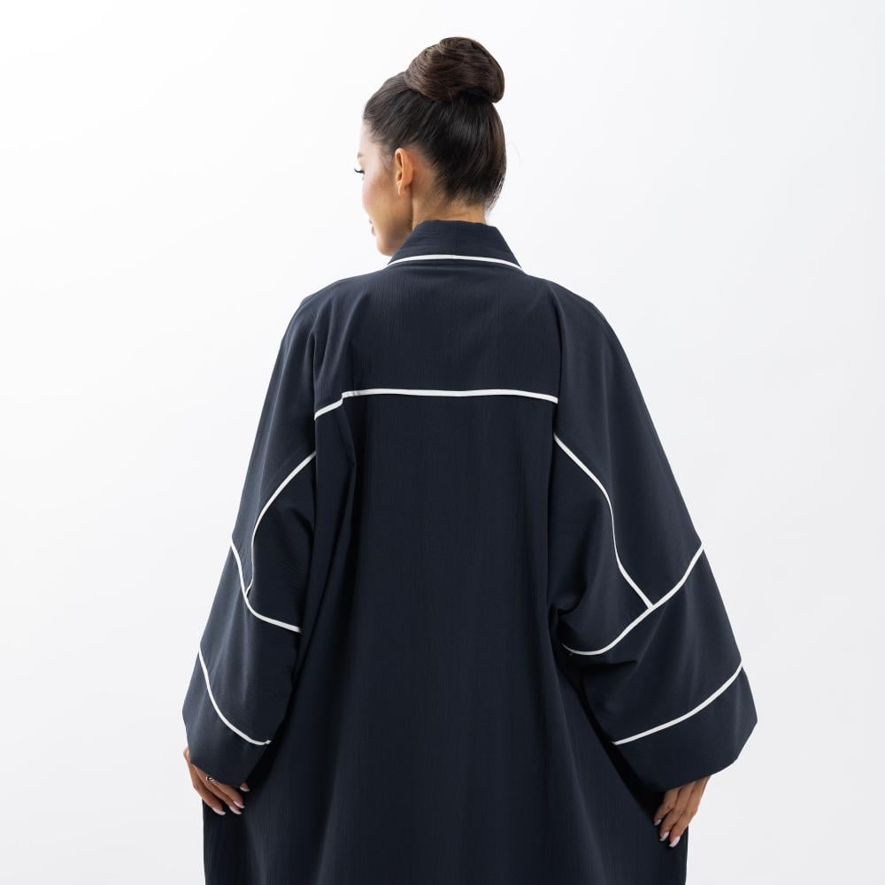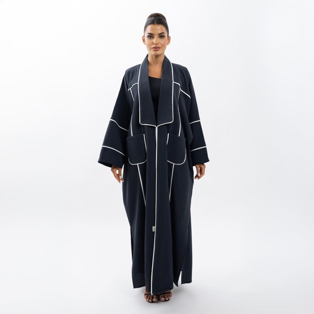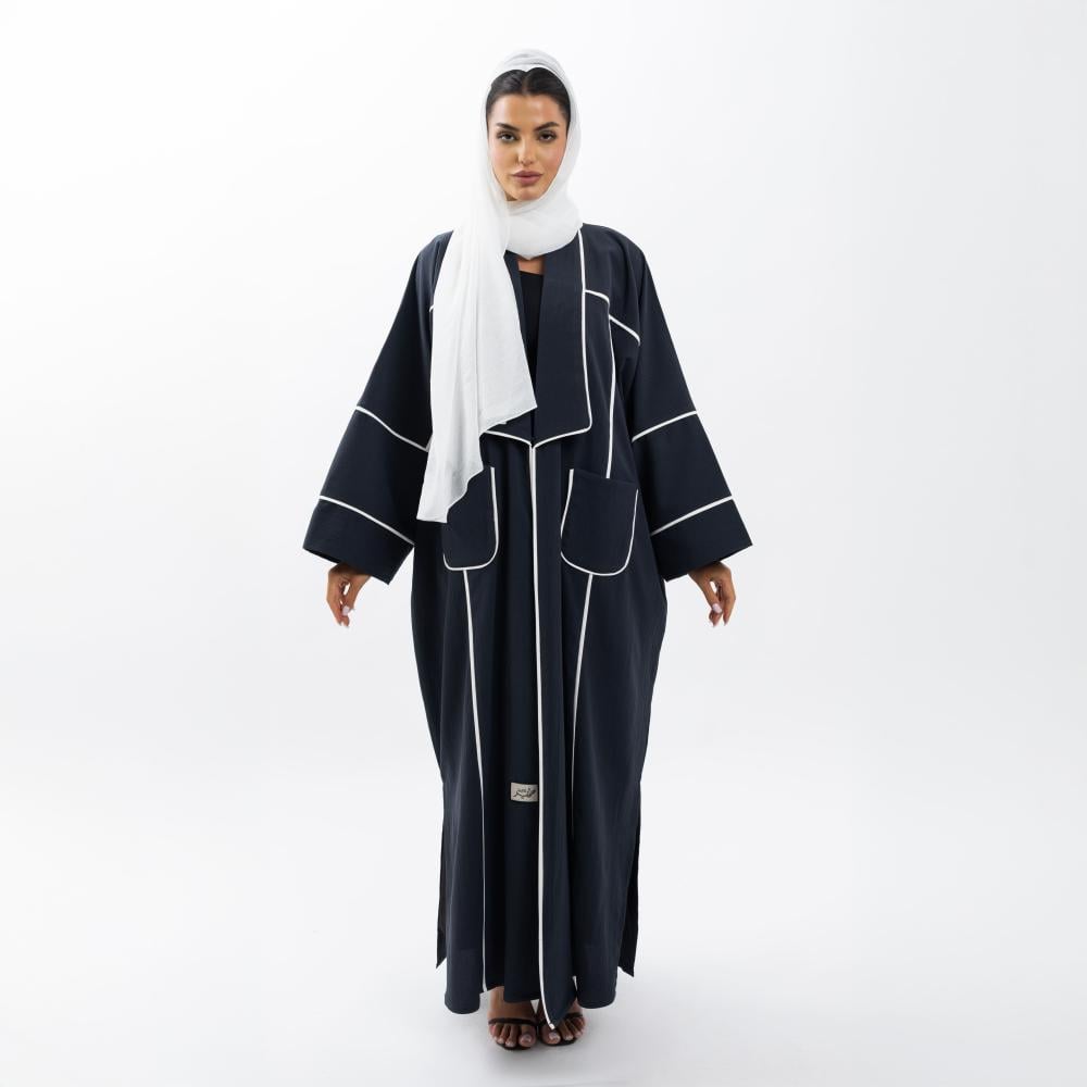 عباية سوداء فاخرة تعكس الأناقة بتصميم عصري مميز، مزينة ببريم أبيض أنيق يمتد على جانبي العباية وطرف الأكمام ليضفي لمسة راقية ومتقنة. تمنحك العباية إطلالة أنثوية راقية تناسب المناسبات الفاخرة والرسمية.