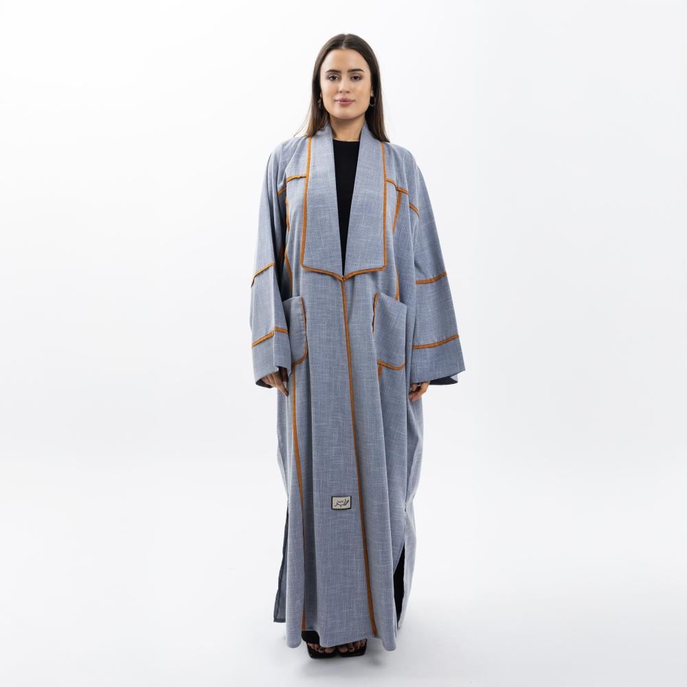 عباية رمادية فاخرة تعكس الأناقة بتصميم عصري مميز، مزينة بخطوط برتقالية أنيقة تمتد على جانبي العباية وطرف الأكمام لتضفي لمسة عصرية متقنة. تمنحك العباية إطلالة أنثوية راقية تناسب المناسبات اليومية والرسمية.